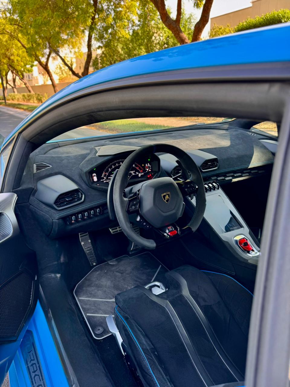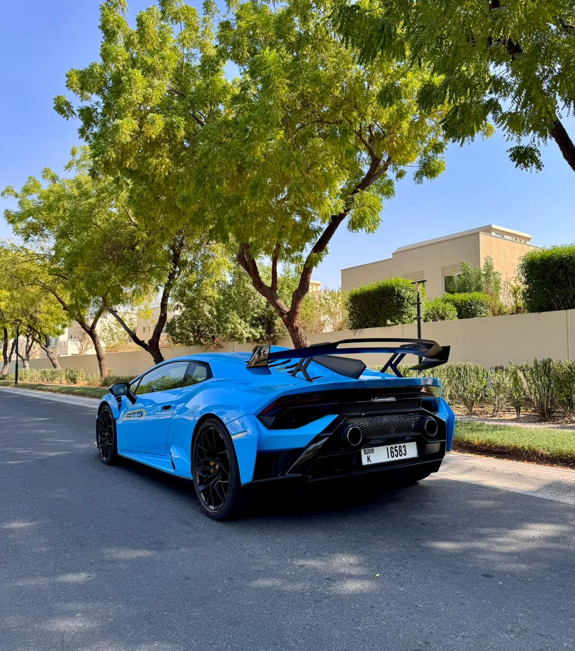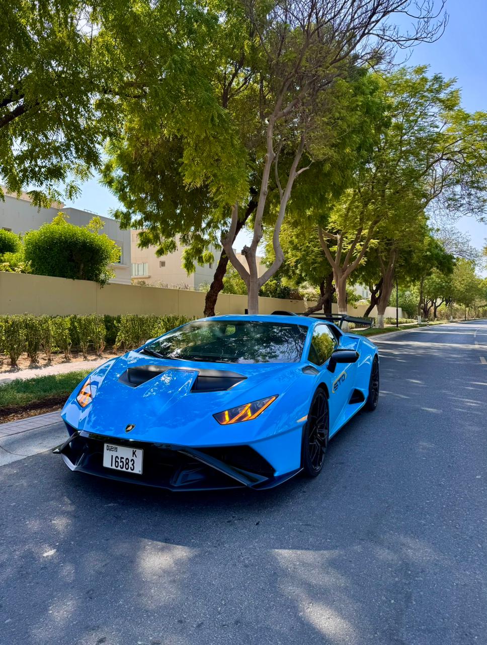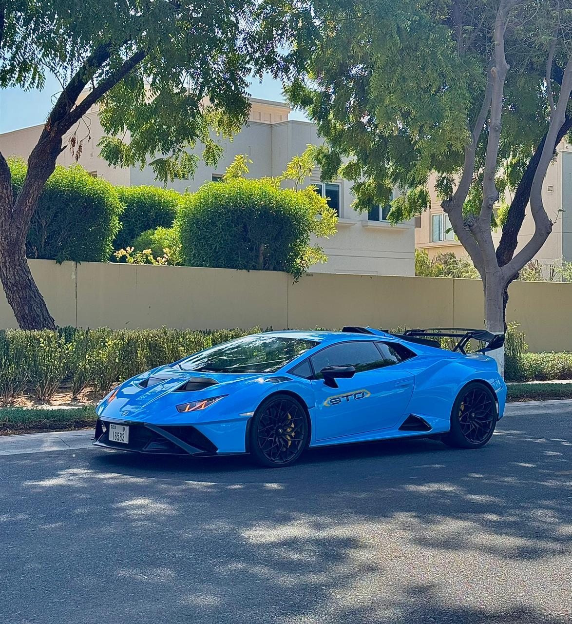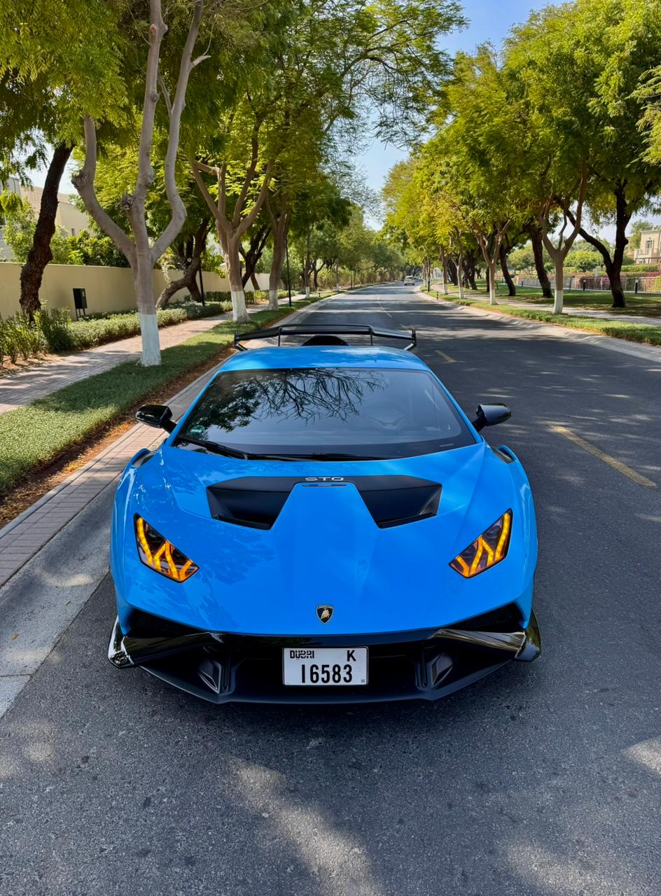 The 2024 Lamborghini Huracán STO is a street-legal race car, powered by a 5.2L naturally aspirated V10 producing 640 hp and 565 Nm of torque. It rockets from 0–100 km/h in just 3.0 seconds, delivering unmatched thrill and performance in Dubai.